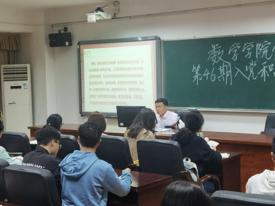 本站讯 5月10日19:00于5511教室,数学学院组织入党积极分子培训第二讲——《明确党的纲领,为实现最高理想和现阶段目标努力奋斗》。数学学院副院长李松华主讲,第46期全体入党积极分子参与本次培训。