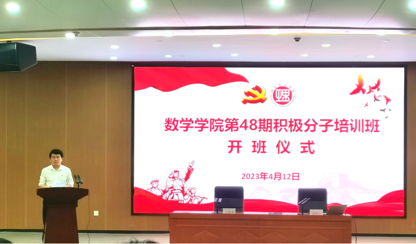 开班仪式在全体人员齐声高唱的《国际歌》歌声中开始,随后数学学院第48期入党积极分子代表2022级学生汪俊炜就自身入党决心及今后的努力方向作了表态发言,最后齐亮菲就如何成为一名优秀党员进行了阐述并对48期积极分子及党员提出了具体要求。