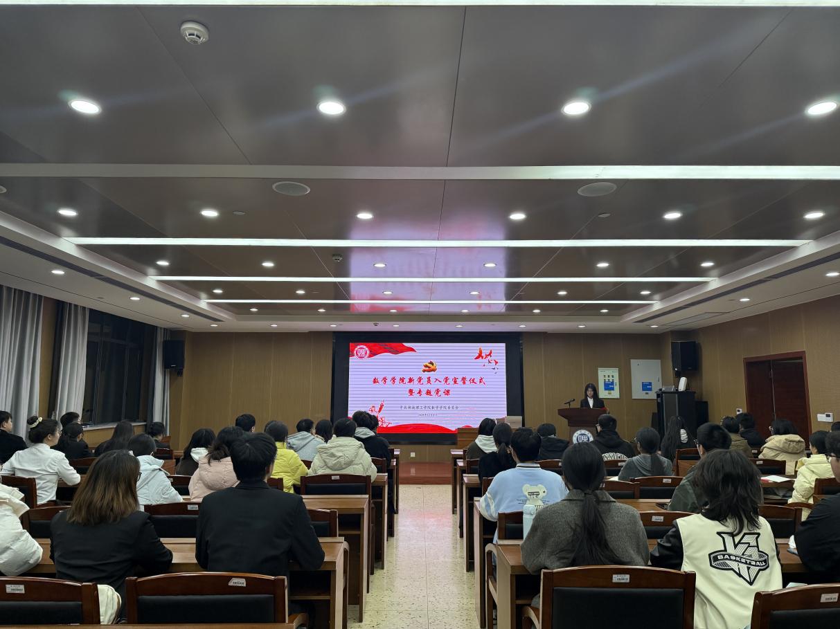 12月3日晚,数学学院在17102会议室庄严举行新党员入党宣誓仪式暨深入学习贯彻习近平新时代中国特色社会主义思想专题党课。学院党委书记江五元、组织员赵馨出席活动,全体学生党员、预备党员及第53期入党积极分子参加。