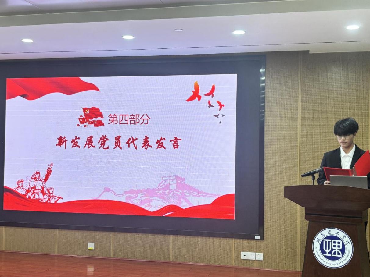 仪式在雄壮的国际歌中正式开始。赵馨老师郑重宣读关于批准接收预备党员和预备党员转正的决议。随后,在新发展党员代表李亚芝的领誓下,全体党员面向党旗庄严宣誓。铮铮誓言回荡全场,表达了新时代青年党员对党的无限忠诚与为共产主义事业奋斗终身的坚定信念。黄卓在发言中深情讲述了党组织对其培养教育的历程,表达了恪守初心、砥砺前行、发挥先锋模范作用的决心。