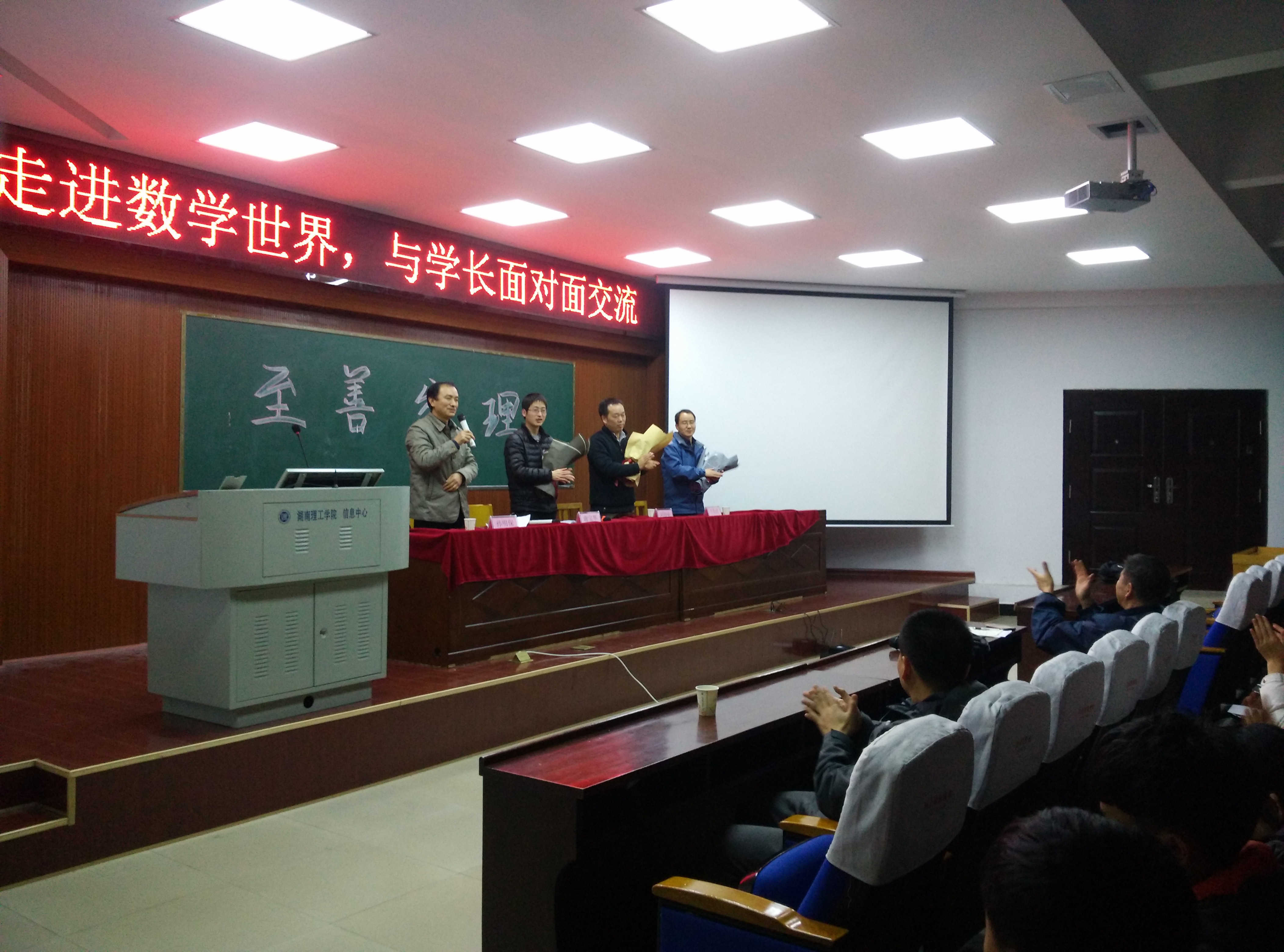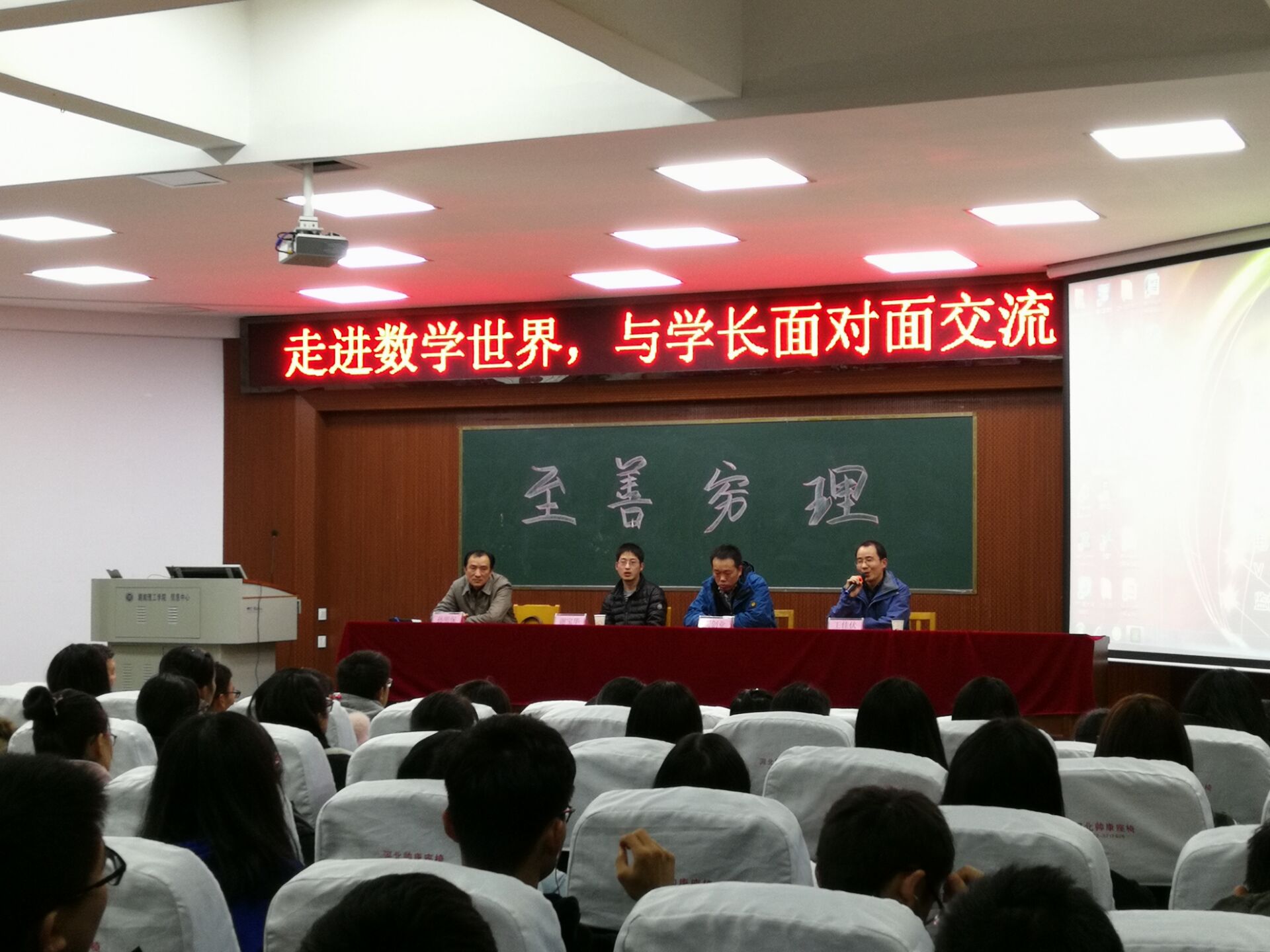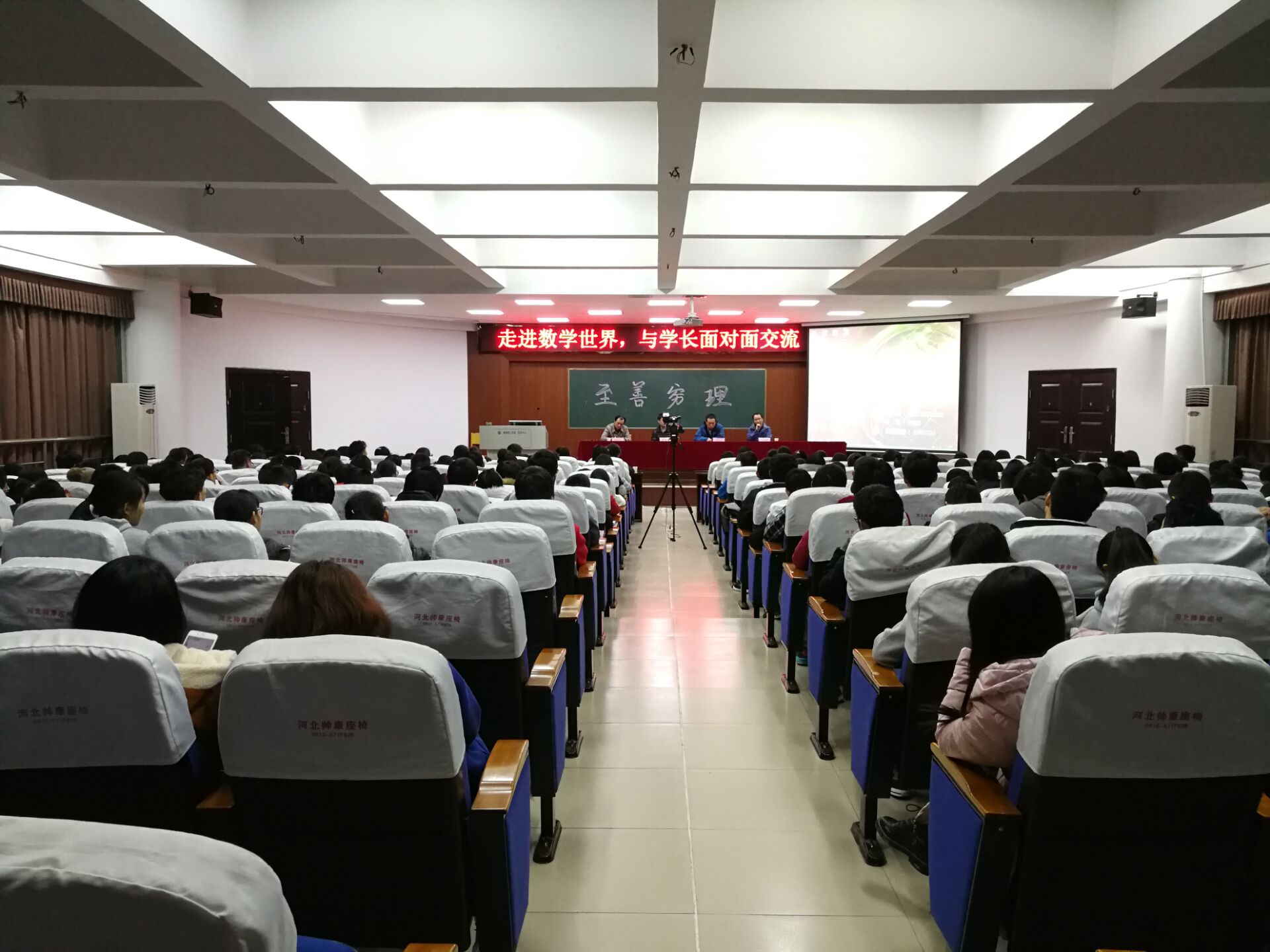 2017年12月1日晚上19点30,2000级优秀校友刘创业,王佳伏,谢宝华于6栋学术报告厅举行“走进数学世界,与学长面对面交流会”主题讲座。数学学院院长孙明保,党总支书记阳鲁平出席,2017级全体学生参加讲座。