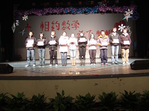 12月24日晚,数学系“相约数学,放飞梦想”学生表彰暨2009年元旦晚会在东院演播厅举行。院党委宣传部部长张剑桥,院党委学生工作部部长柳周峰,数学系系主任孙明保、系党总支书记甘向阳、系副主任周立仁、系副主任丁卫平、系党总支副书记李丽荣以及数学系系其他大部分师生出席晚会。