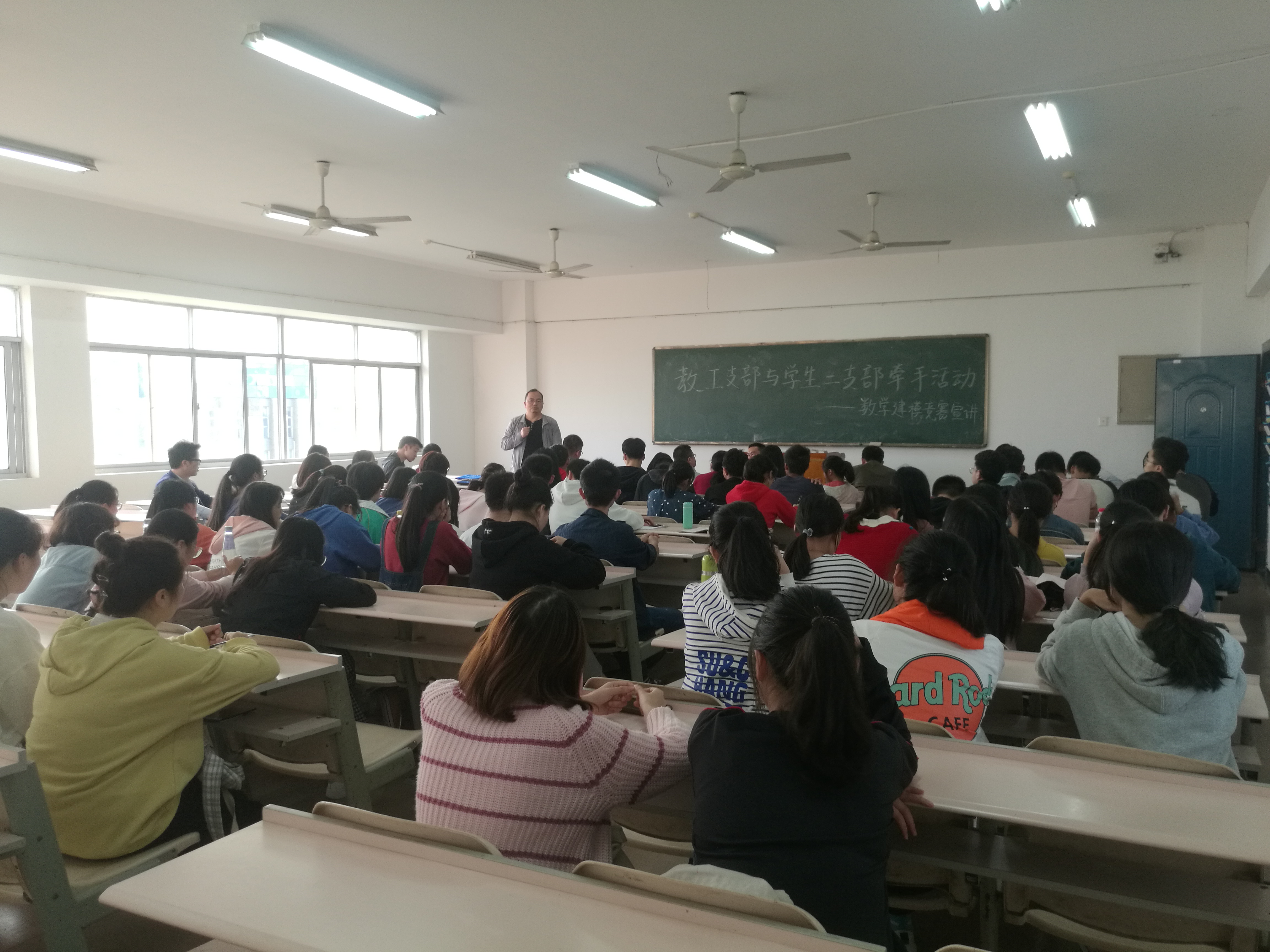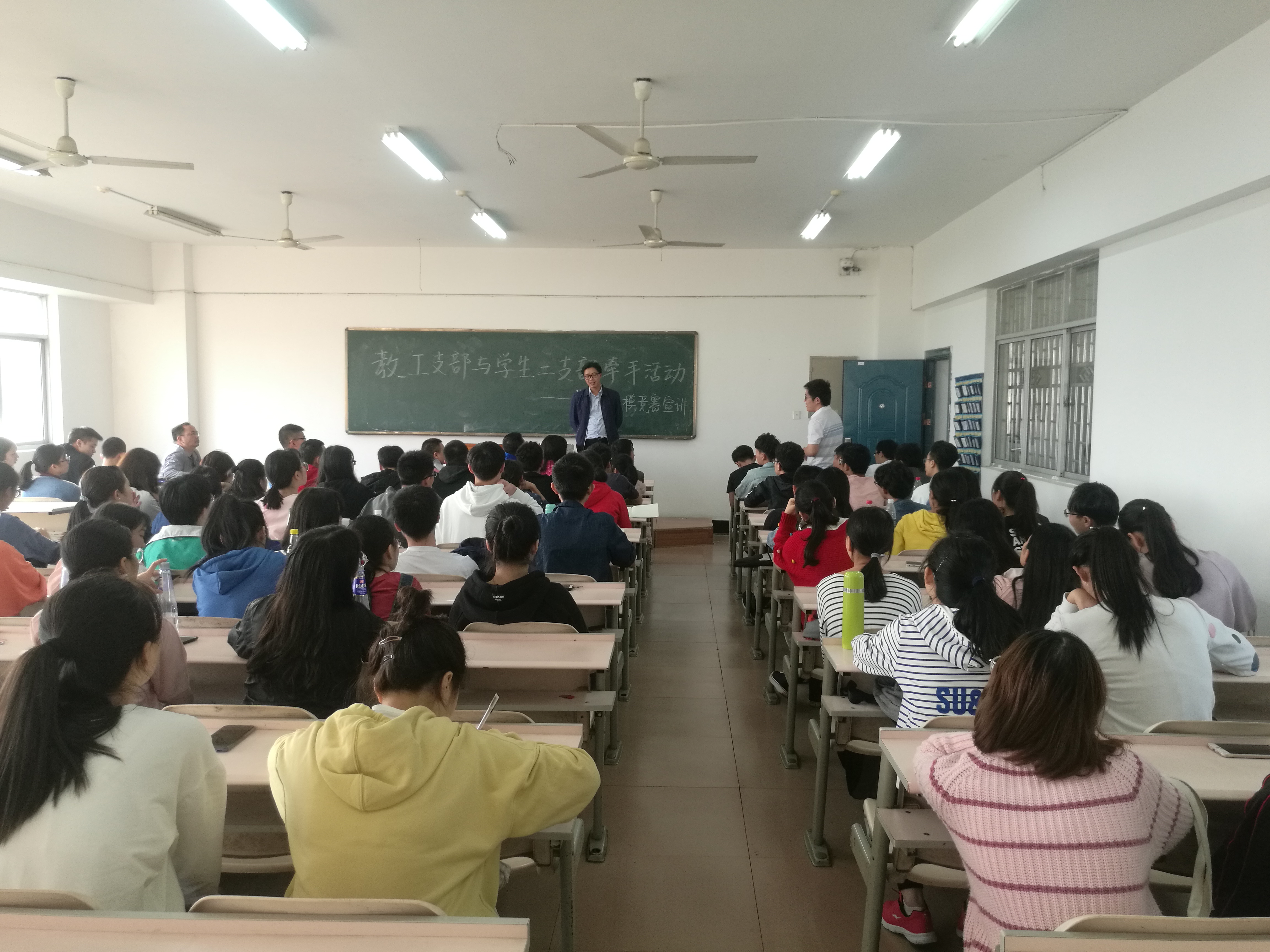 本站讯2018年10月17日,数学学院教工二支部与学生二支部在5505开展“数学建模竞赛宣讲”为主题的支部党员大会,本次会议由何帆老师与彭庆军老师主讲,彭定忠老师、李新平老师以及数学学院学生第二支部全体党员、预备党员、发展对象、入党积极分子参与本次会议。这是教师支部和学生支部牵手的具体实践。