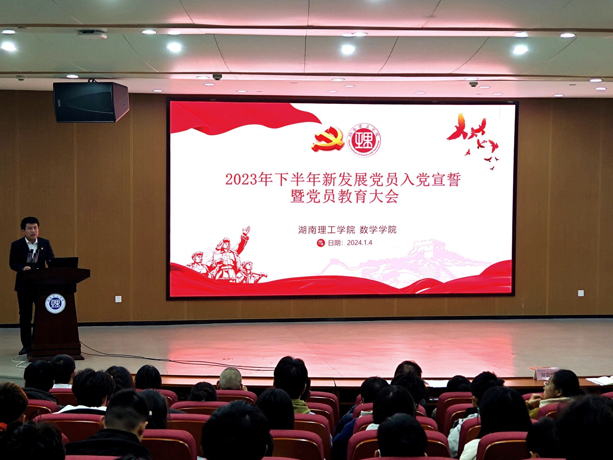 1月4日,数学学院在17118报告厅召开新党员宣誓仪式暨党员教育大会。校党委委员、纪委书记谢贵辉,太阳成集团tyc151cc副书记江五元(主持工作)、副院长李松华、副院长黎丽梅、组织员易政群出席,部分教工党员及全体学生党员、预备党员、入党积极分子与会。