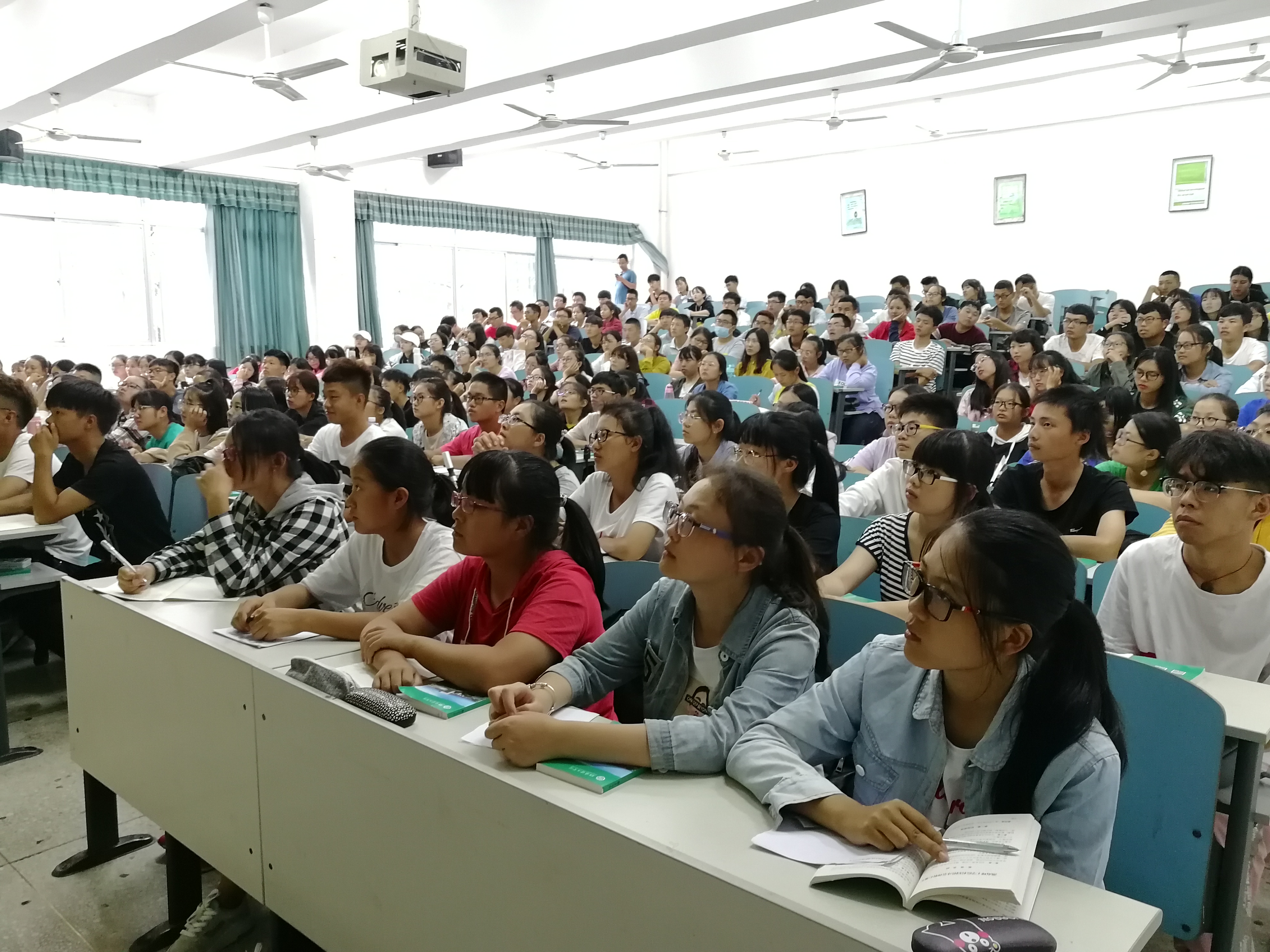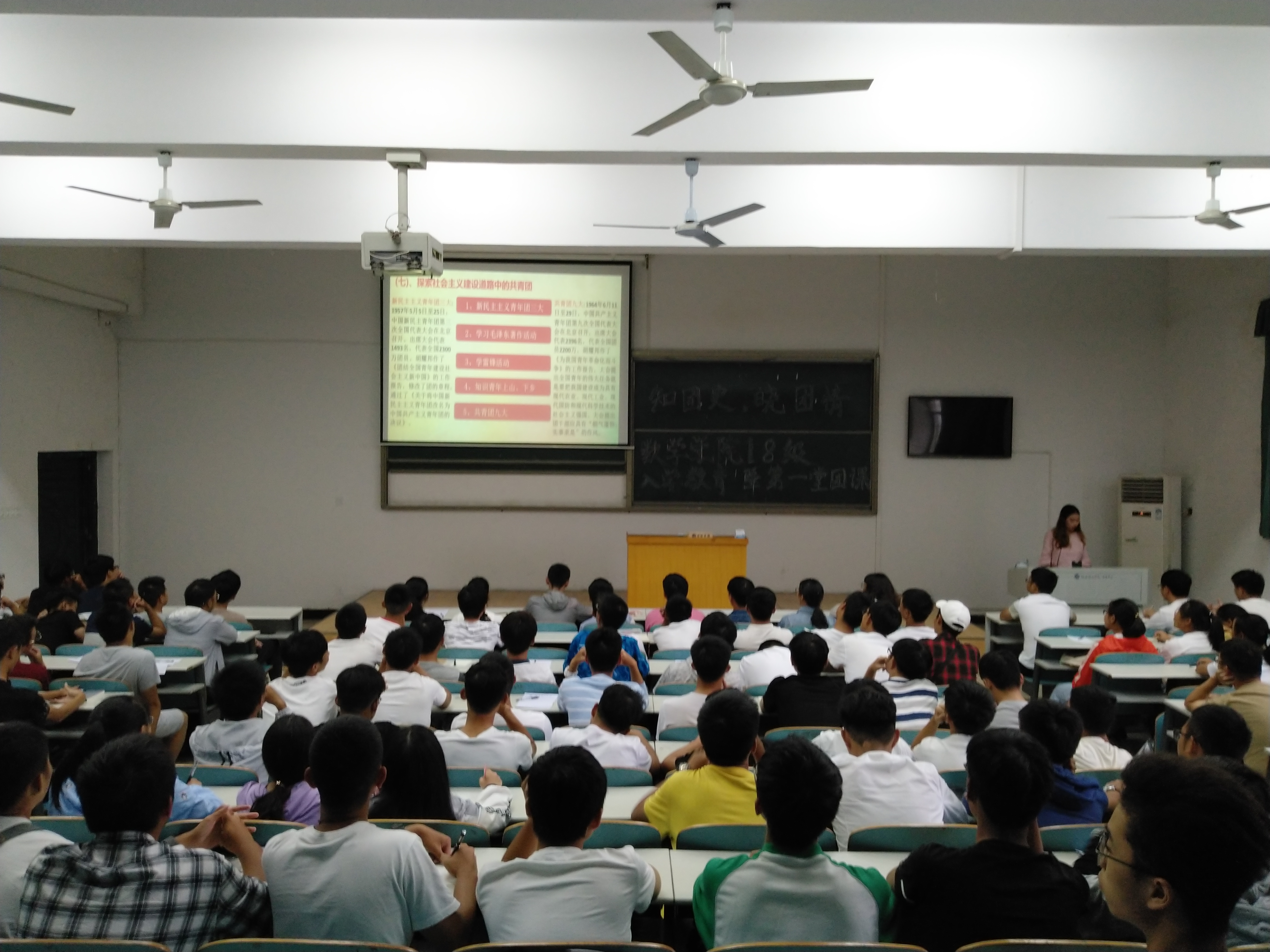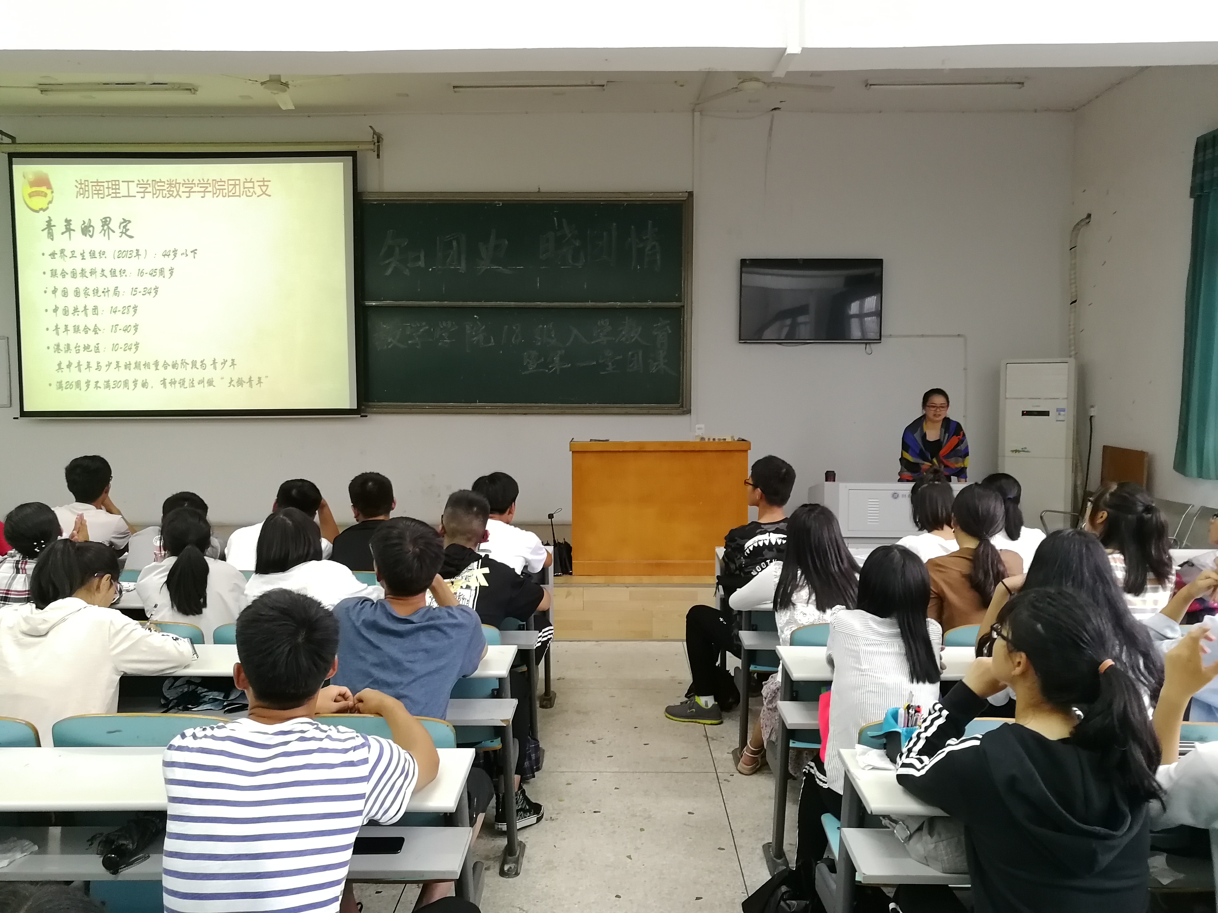 本站讯 9月25日下午,数学学院于9T1、9T2教室开展以“知团史,晓团情”为主题的18级入学教育暨第一堂团课讲座。此次讲座由数学学院团总支书记傅丹、团总支副书记练梦竹主讲,数学学院18级全体新生参加。