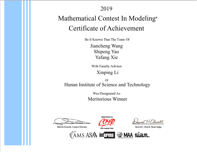 日前,2019年美国大学生数学建模竞赛与交叉学科数学建模竞赛(MCM/ICM)成绩揭晓,数学学院首次组队参加,李新平、何帆、彭定忠等老师指导的参赛队伍全部获奖,其中李新平老师指导的队伍荣获国际一等奖1项,今年全球获奖率一等奖仅6%。