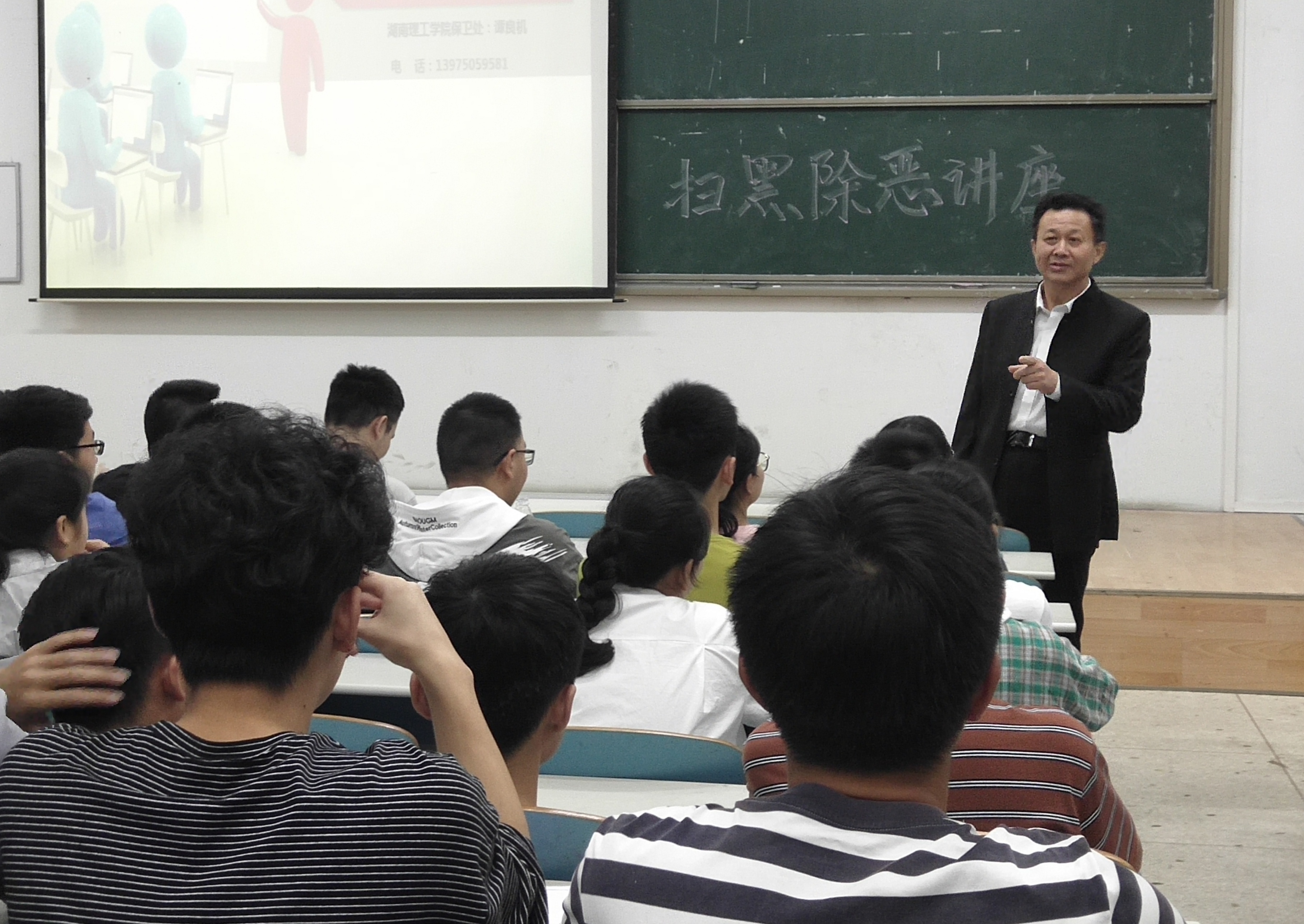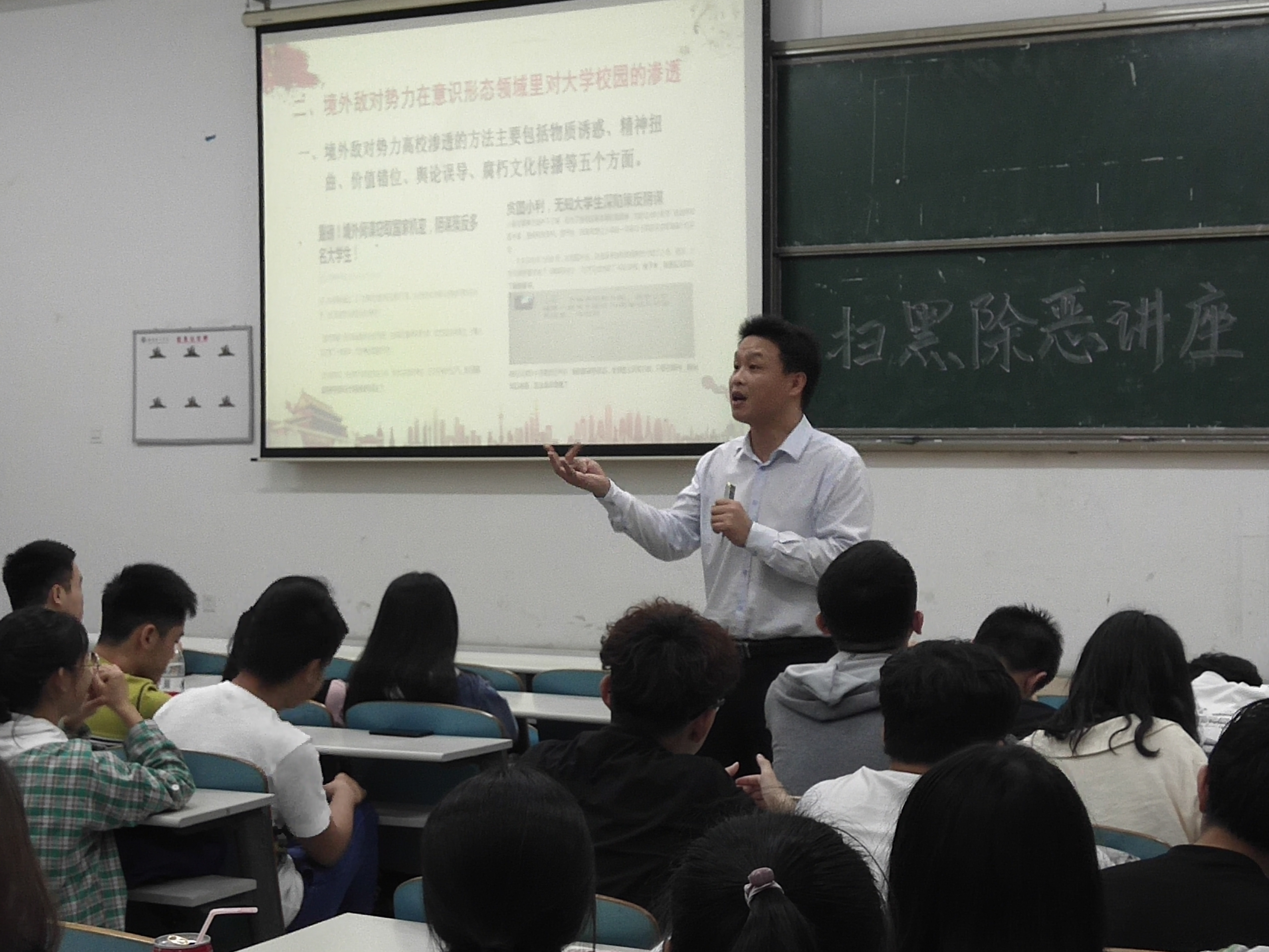 本站讯 本周二晚七点,数学学院17、18级部分同学于9T1教室参加了反黑除暴安全教育讲座,此次讲座的主讲人为太阳成集团tyc151cc保卫处谭良机处长,数学学院党总支副书记易政群老师出席了本次讲座。