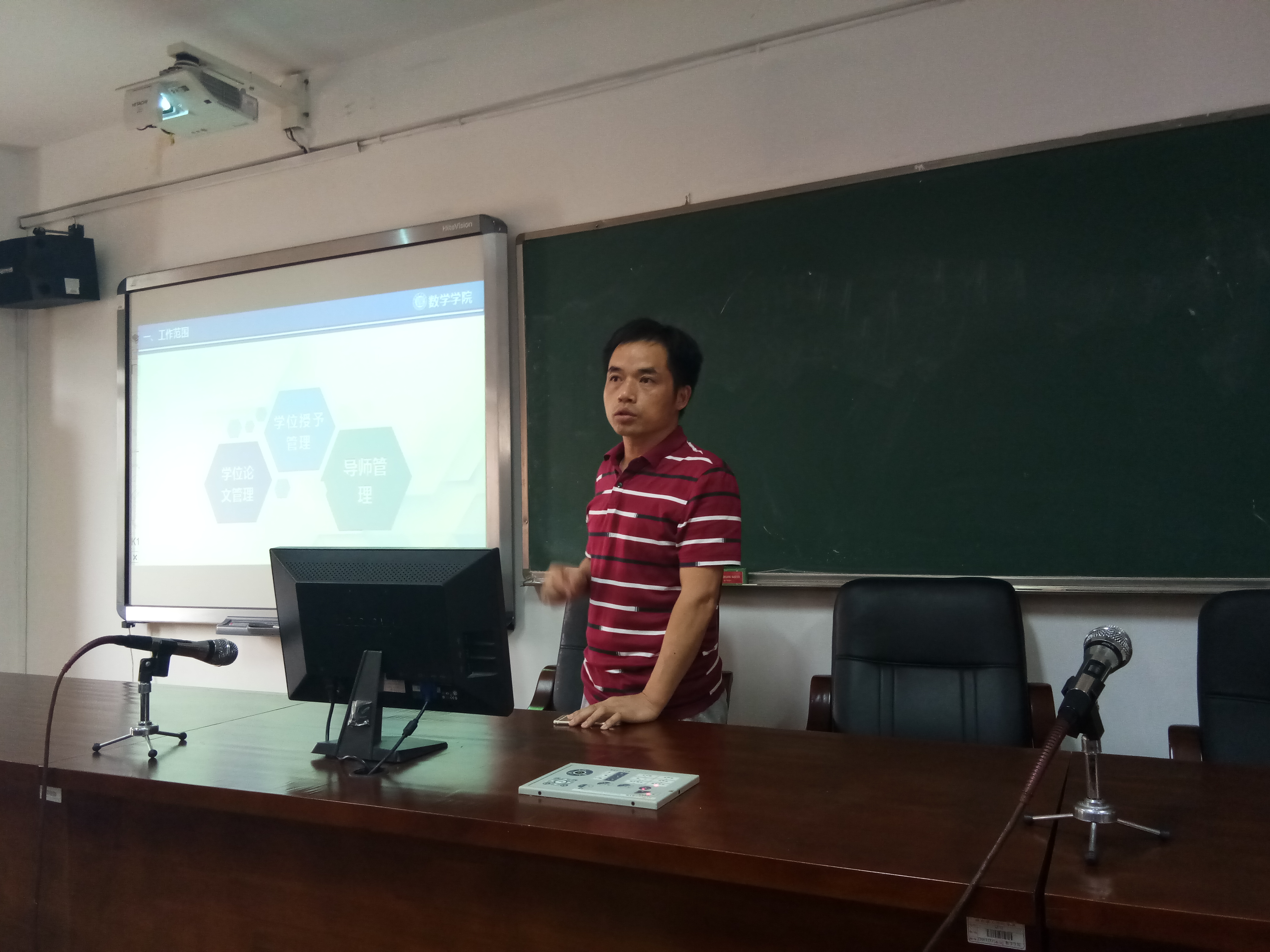 2019年9月17日下午16:00,数学学院于5511举行2019级研究生入学教育。学院副院长(主持工作)江五元,党总支书孙明保,党总支副书记易政群,研究生教学秘书和辅导员出席活动。数学学院2019级13名全体研究生新生参加。活动由学院副院长江五元主持。