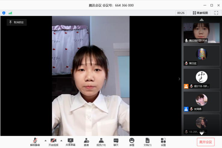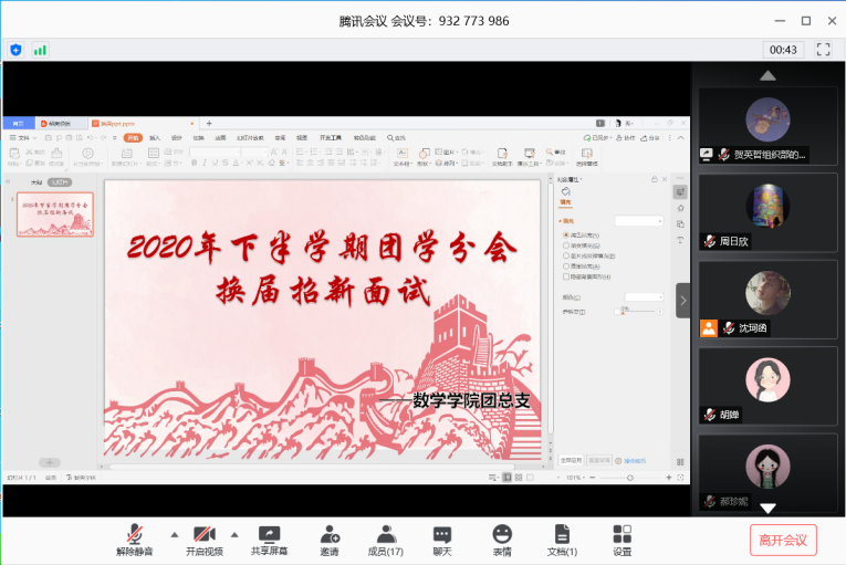 本次线上团学分会换届会议的顺利召开,确定了一批新的团学分会成员,同时数学学院注入了新的血液,带来了新的活力。面试前的紧张和焦虑必不可少,但这一次次的挑战都是对自己最大的认可,这不仅锻炼了干事们随机应变的能力,更是要求他们今后积极投身到工作中去,一同为建设更好更强的数学学院而努力。