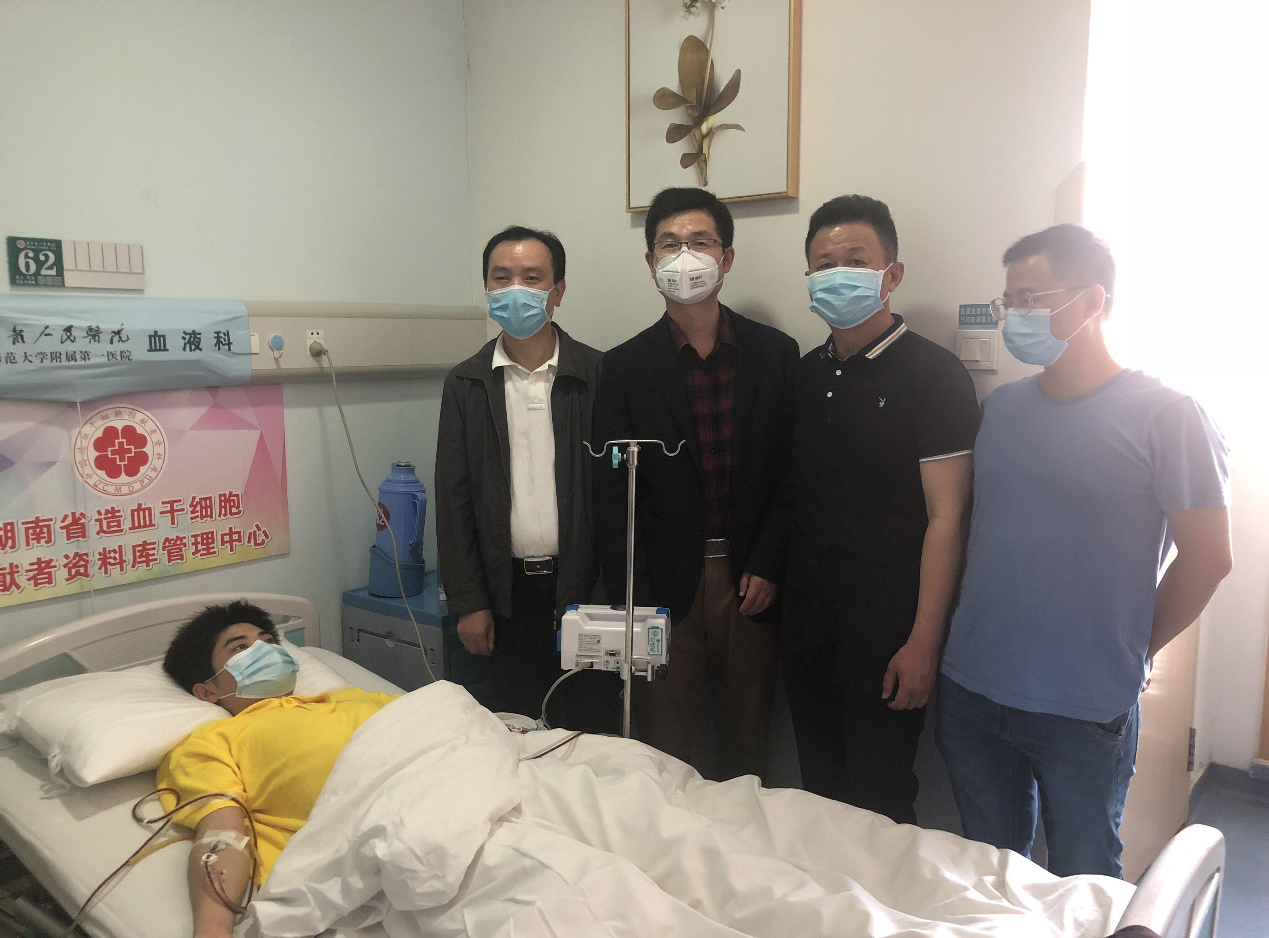 本站讯 4月29日,数学学院18级信息与计算科学二班的周晨曦同学在湖南省人民医院进行了造血干细胞捐献。近十几年来,太阳成集团tyc151cc数学学院一直坚守与岳阳市血站的合作,给无数人传递了生的希望。周晨曦同学是数学学院第一位进行造血干细胞捐献的学生。学校学工部副部长王云朋和数学学院书记孙明保、副书记易政群、辅导员李哲君前往看望,并送上校长奖学金和学院慰问金。