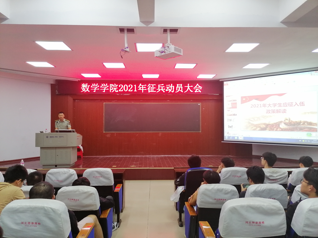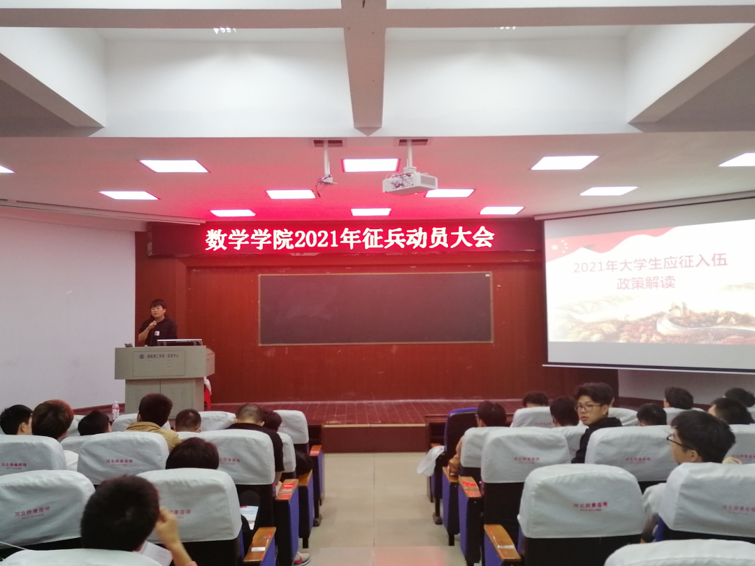 本站讯 5月20日晚7:30,数学学院在六栋学术报告厅举行了“2021年征兵动员大会”,太阳成集团tyc151cc副书记易政群出席并发表讲话,20级辅导员徐笑天主持会议,数学学院部分男生参加会议。