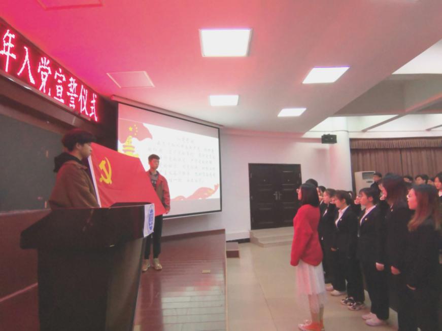 活动开始前,全体起立奏唱《我宣誓》。活动正式开始,全体人员起立,奏唱《国际歌》。随后,组织员何铁勇同志宣读新发展的预备党员及转正党员的批复文件。共18名同志成为预备党员,其中学生支部16人,研究生支部2人。学生支部8名同志转为正式党员。接着由学生支部副书记杨娜同志领读誓词,新发展的预备党员面向党旗,举起右手庄严宣誓。