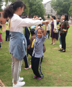 本次活动是由一个有趣的游戏开始的。老师,志愿者和孩子们先手拉手围成一个大圈,然后志愿者和孩子们背后被贴上木板或小松鼠的卡片,接着每两个背后写着木板的卡片的小朋友就手牵手举高搭成一个房子的形状,去寻找一个背后贴有小松鼠的卡片的小朋友带回房子里保护着。最后,能成功的找到小松鼠并好好保护着的小组就会有奖品奖励。活动过程中寓教于乐,进展顺利,志愿者和孩子们在蔡老师和傅老师的组织带领下积极融入到游戏中,和乐融融。